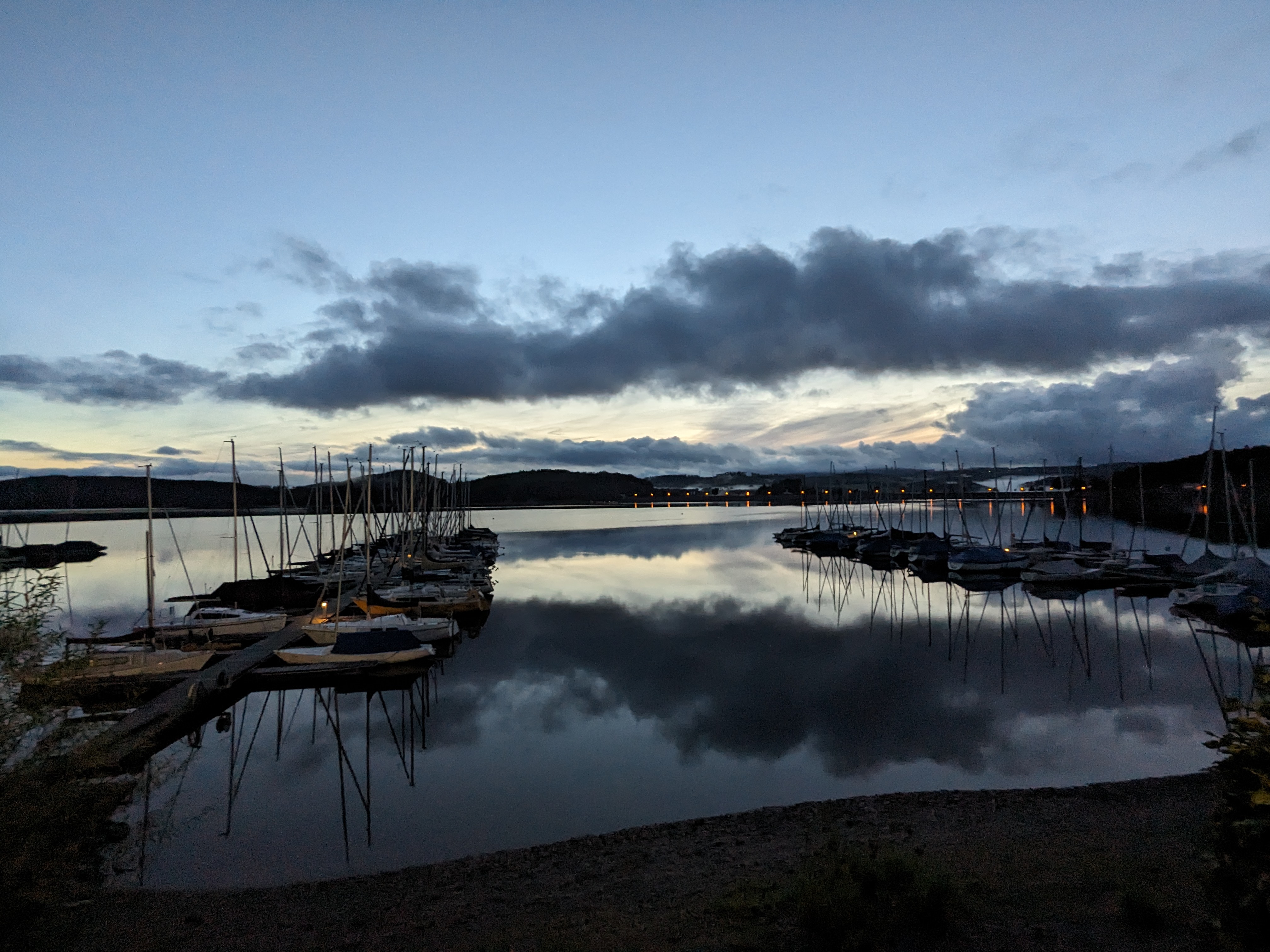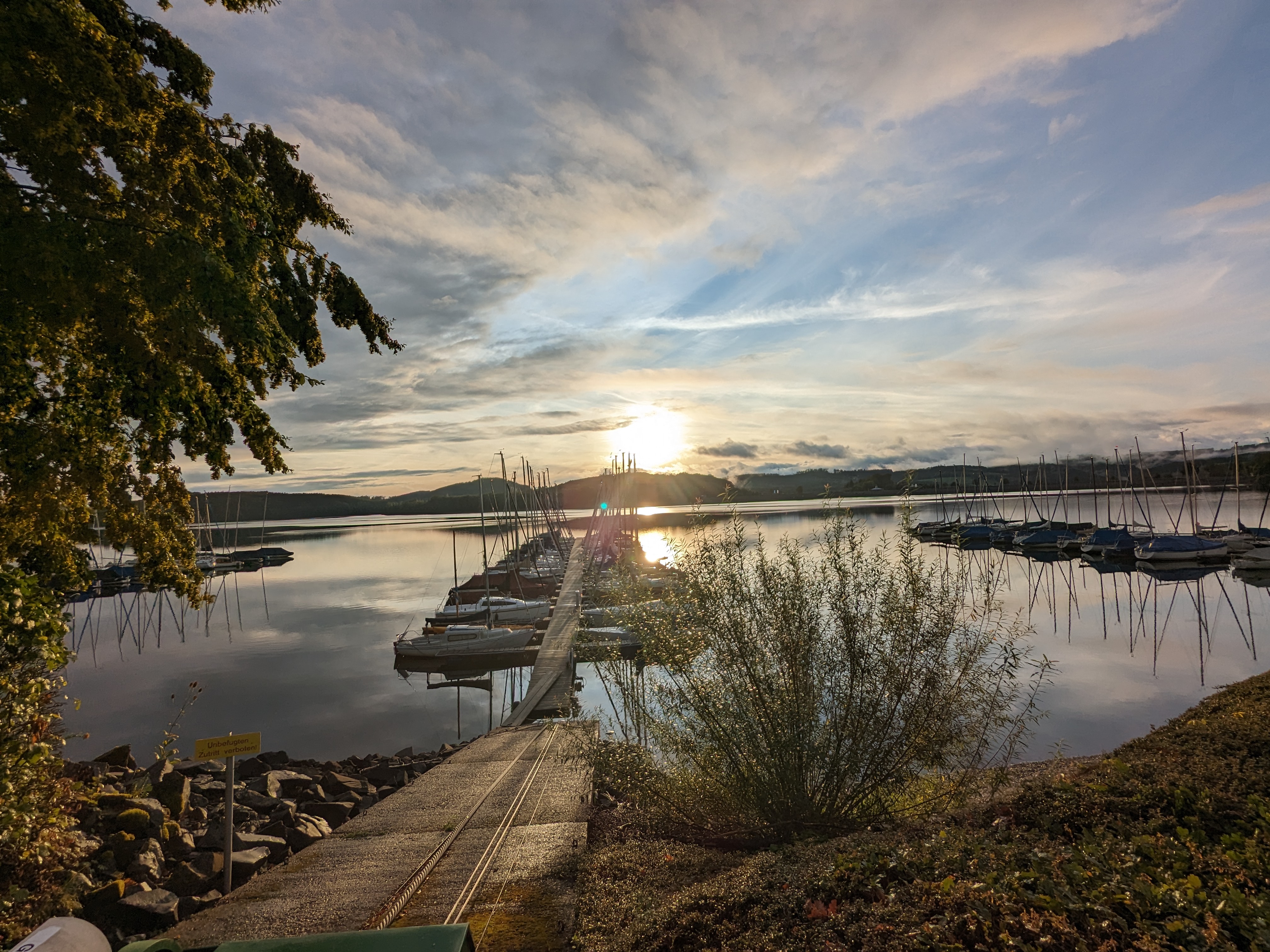 Nach mehrfacher Bewerbung der Veranstaltung per Mail und Mundpropaganda stieg die Anzahl der Interessenten von zunächst 80 auf 100 und einen Tag vor der Veranstaltung sogar auf rund 110. Leider spielte das Wetter nicht mit und es regnete bis zum Veranstaltungsbeginn, zum Teil recht heftig. Schade, denn neben einem durchaus attraktiven Innenleben bietet das weitläufige Gelände des Yacht- und Ruderclubs ein besonderes, maritimes Ambiente. Immerhin verlagerte sich der gemütliche Teil des Abends zumindest zeitweise nach draußen, nachdem der Regen abgezogen war und zum Sonnenuntergang bot sich dem Betrachter ein malerisches Bild über den See.